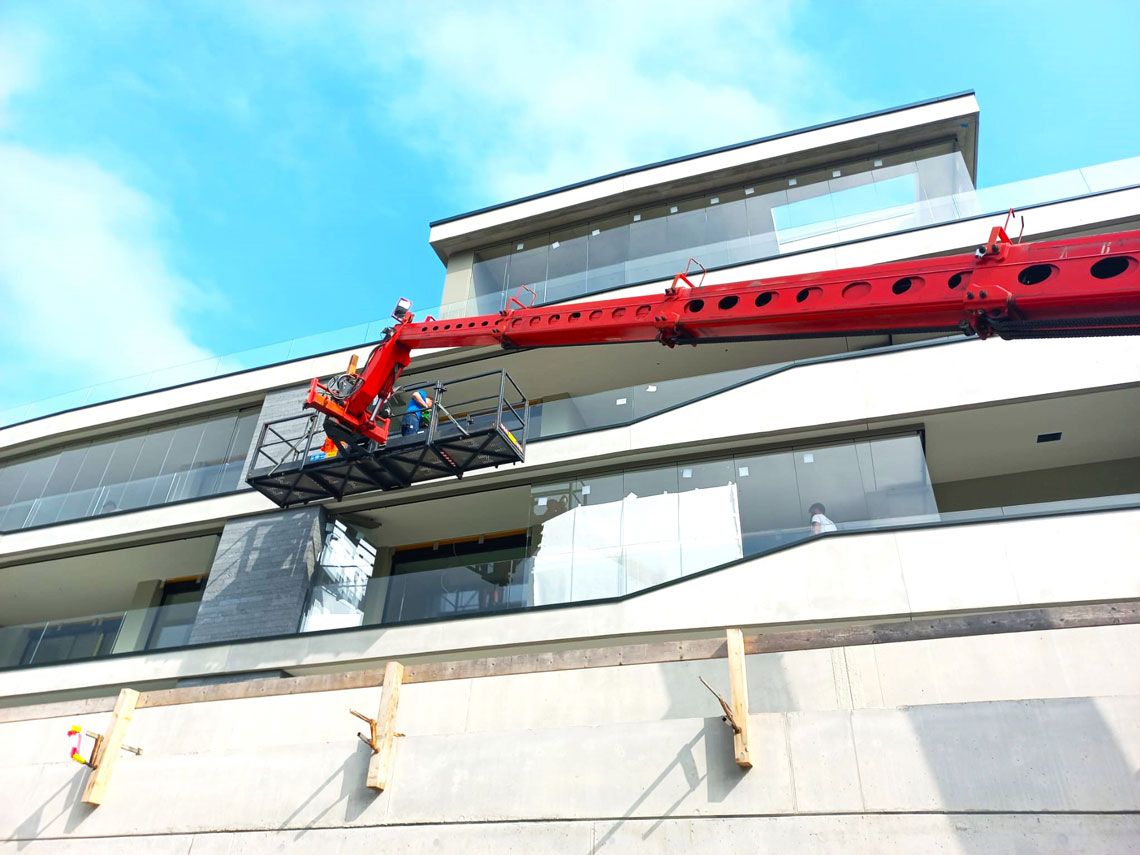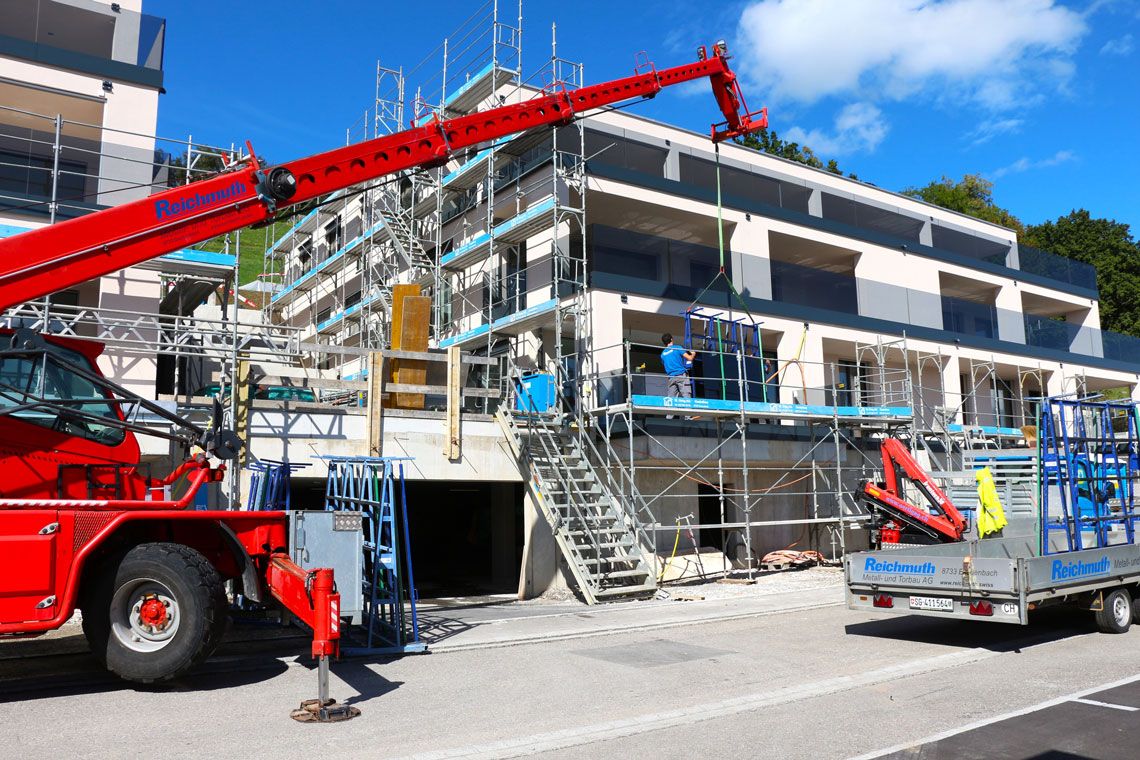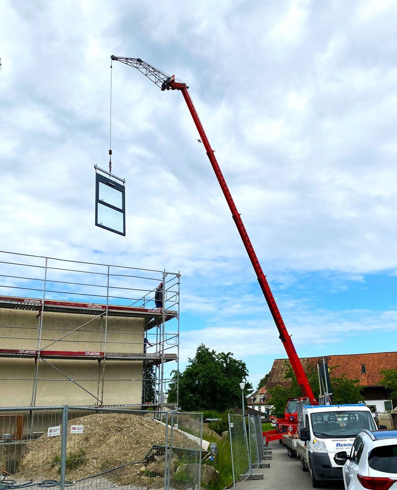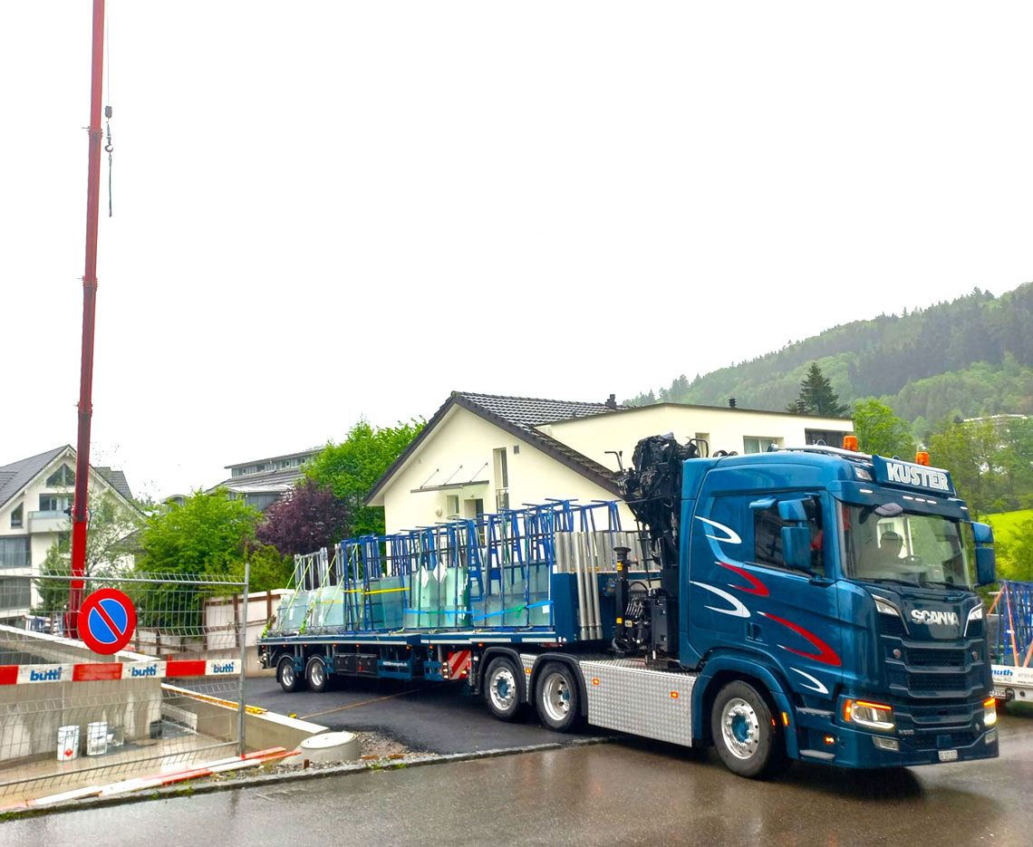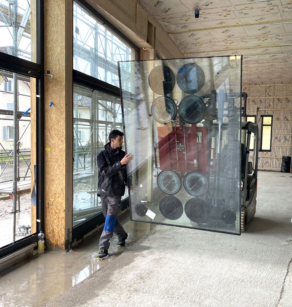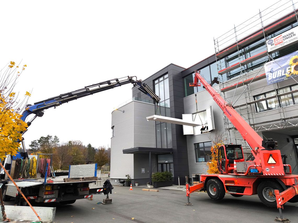 Unsere hochqualifizierten Montageteams führen die gesamte Montage mit Präzision und Effizienz aus. Je nach Grösse und Gewicht der Elemente oder nach Zugänglichkeit setzen wir auf technische Hilfsmittel wie Teleskopstapler, LKW-Kräne, Sauganlagen oder Hebebühnen. Damit fördern wir einen zügigen Montageablauf und gewährleisten höchste Sicherheit.